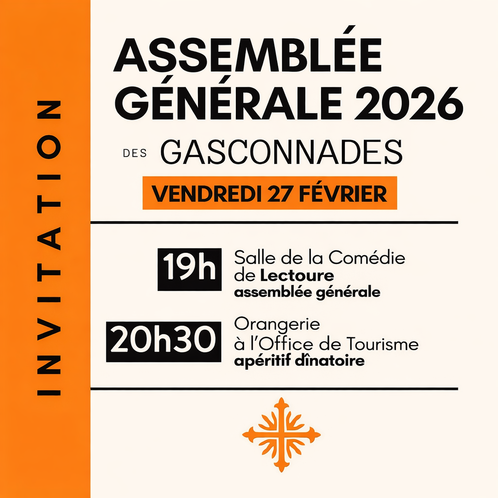 Nous avons le plaisir de vous inviter à l’Assemblée Générale des Gasconnades, qui se tiendra le 27 février prochain à 19h, à la Salle de la Comédie de Lectoure.